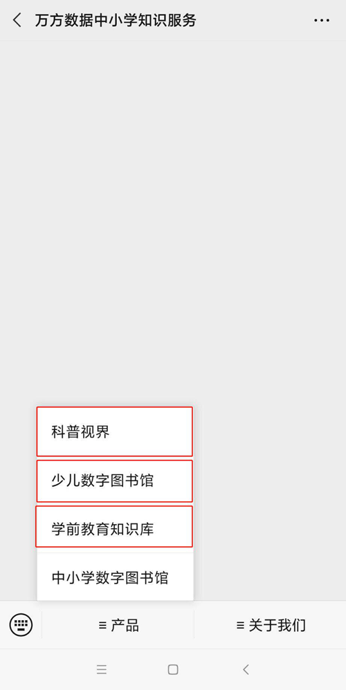 活動(dòng)期間內(nèi),在微信中搜索到“萬(wàn)方數(shù)據(jù)中小學(xué)知識(shí)服務(wù)”微信公眾號(hào),選擇左下方的“產(chǎn)品”鏈接,點(diǎn)擊選擇“產(chǎn)品”中的“科普視界”“少兒數(shù)字圖書館”“學(xué)前教育知識(shí)庫(kù)”,即可直接打開(kāi)進(jìn)行資源的在線閱讀。
