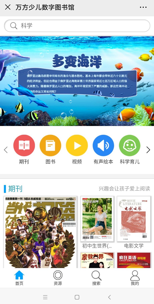 資源包括:優(yōu)質(zhì)的科普視頻資源、精美的有聲繪本、各類豐富的期刊文獻(xiàn)、圖書、視頻。暢游知識(shí)海洋,定會(huì)收獲多多!