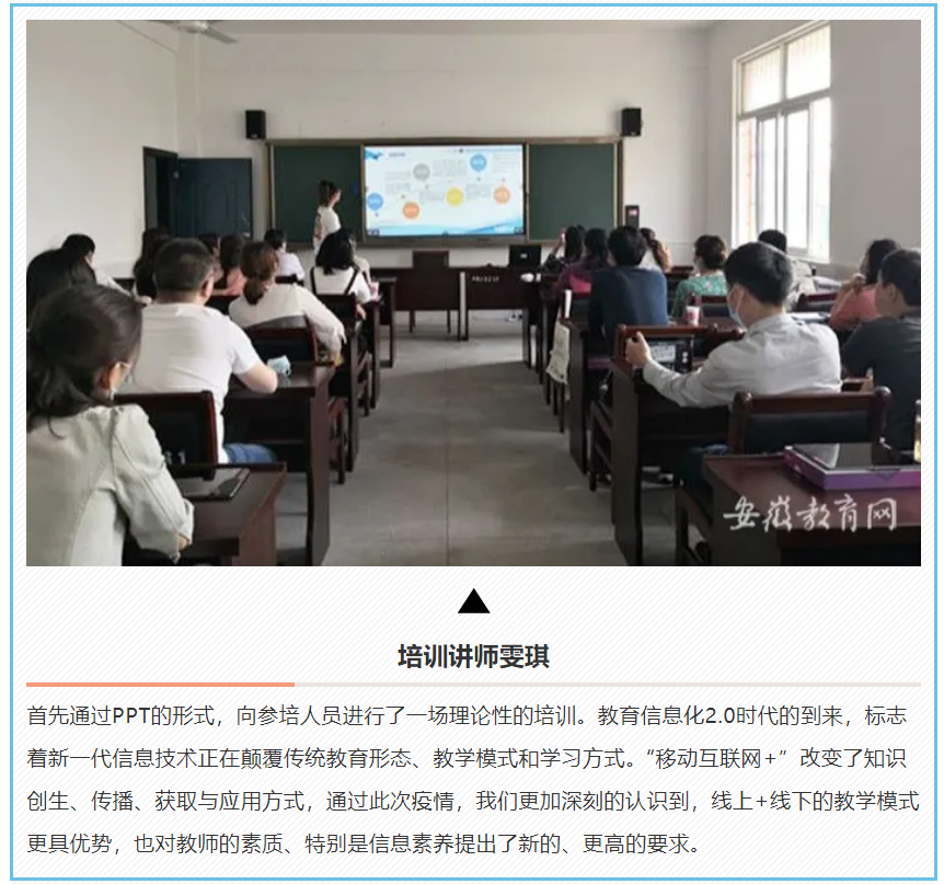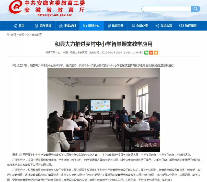 報道中指出,天立泰智慧課堂培訓講師在5月15—17日前往和縣青少年活動中心,分別開展了項目學校管理人員、小學學科教師、中學學科教師三個培訓場次。