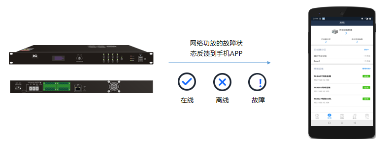 廣播的智慧不斷升級,云播系統支持手機APP在線實時查看網絡功放是否處于故障狀態、還可實時查看報警狀態,及時維護,保障系統正常運行。PC端軟件支持設備遠程固件升級,無需換貨拆機,一鍵批量升級,自動升級降低系統維護成本。