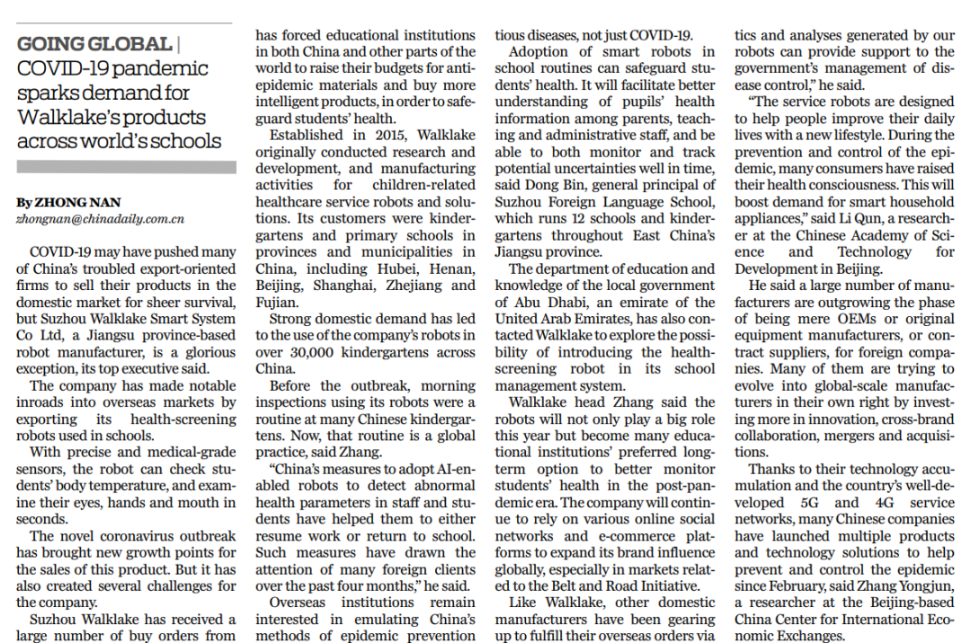蘇州沃柯雷克晨檢機器人正在被全球媒體聚焦。7月13日,《中國日報》以《Robots safeguard students' health》為題,主版頭條刊發了對沃柯雷克晨檢機器人助力復學的報道。這也是繼3月23日中國日報國際版刊發對沃柯雷克晨檢機器人助力中國校園防疫復學的報道后,官方媒體再度“點名”沃柯雷克晨檢機器人。