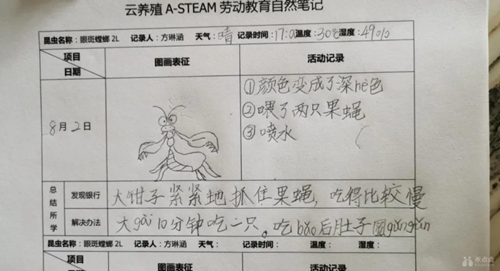 “從起初的害怕昆蟲到和小伙伴們一同養殖螳螂,再到研究若蟲的雌雄分類,寫出觀察筆記,我會在每個階它們觀測捕食量是多少?進食時間多少?如何控制運用傳感器控制棲息地溫度,加上控制投食量一起來延長雄性螳螂成熟期… …”,介紹的是一個一年級的小女孩。同學們越做越有體會,讓數據開口說話,解決城市和棚室蚊蠅多的真實問題及背后蘊含的生態問題。
