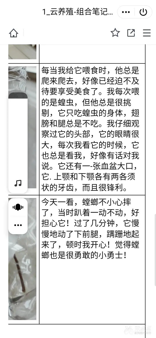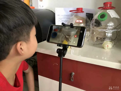 “若蟲又要蛻皮了,我這樣拍視頻,能避免了畫面抖動,畫面清晰多了”,同樣是一年級的小男孩陸涵分享到,他正在調試手機支架尋找拍攝最佳角度,除了拍攝、他和小伙伴們日常還會用文字、畫圖等形式,不漏掉每個細節。