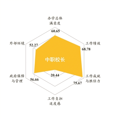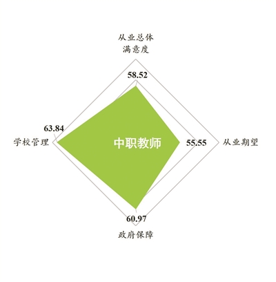 2019年,中職教師從業滿意度得分為58.52分,和2016年相比,下降了3.91分,總體滿意度高于職業期望,差值為2.97分。校長辦學滿意度得分為60.65分,校長總體滿意度和內部滿意度、外部滿意度各維度得分自東部地區向西部地區梯度下降。
