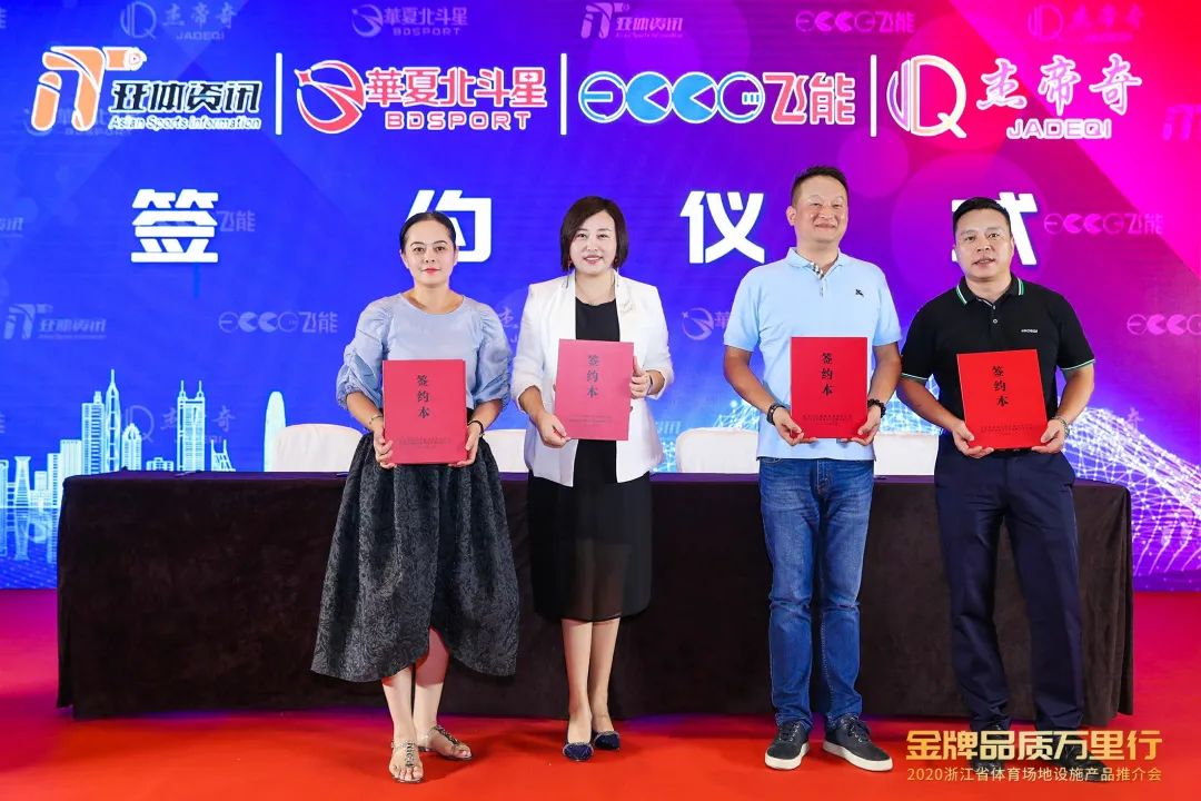 最后,四家公司共同簽下了「金牌品質承諾書」。四家中國體育設施行業(yè)翹楚企業(yè),向浙江體育設施建設行業(yè)保證保質,等于立下軍令狀,表決堅守品牌的精神,用自身行動為中國牌增采,為浙江體育場地設施建設添磚加瓦。除了產品推介之外,廣東北斗星體育設備有限公司、河北杰帝奇體育用品有限公司、南京飛能橡塑制品有限公司與浙江亞仕麗體育文化發(fā)展有限公司(亞體資訊)進行了簽訂戰(zhàn)略合作協(xié)議。強強聯(lián)合,共同書寫體育場地設施產業(yè)新篇章。
