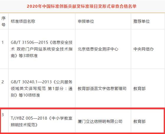 教育部推薦、國家市場監管總局評選!立達信提出并起草的教育照明標準入選2020年中國標準創新貢獻獎形式審查合格名單!