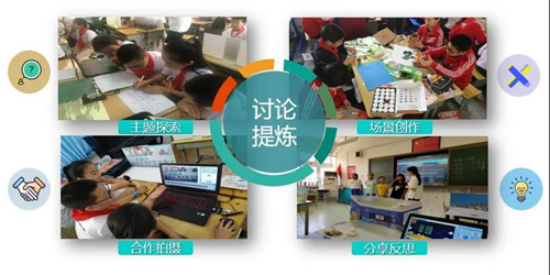 課堂上,學(xué)生以小組為單位,創(chuàng)設(shè)復(fù)雜、有意義、結(jié)合學(xué)生生活實(shí)際的問題情境,通過主題探索、場景創(chuàng)作、合作拍攝與分享反思四個(gè)環(huán)節(jié)開展項(xiàng)目式學(xué)習(xí),培養(yǎng)學(xué)生整合運(yùn)用語文、美術(shù)、音樂、信息技術(shù)和與項(xiàng)目相關(guān)的學(xué)科知識與技能,為學(xué)校打造多學(xué)科融合應(yīng)用的創(chuàng)新學(xué)習(xí)模式。