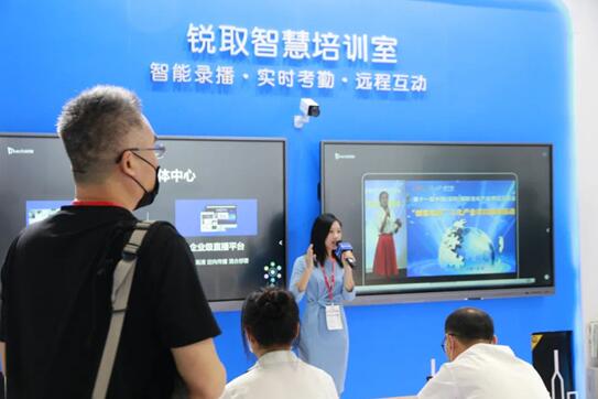 針對企業多地同步培訓、實現多方遠程互動培訓需求,本次展會銳取還展出高性價比、智能化的整體解決方案——銳取智慧培訓室,無需裝修、簡單部署即可實現多方遠程互動培訓,滿足用戶線上線下培訓學習的全場景應用。