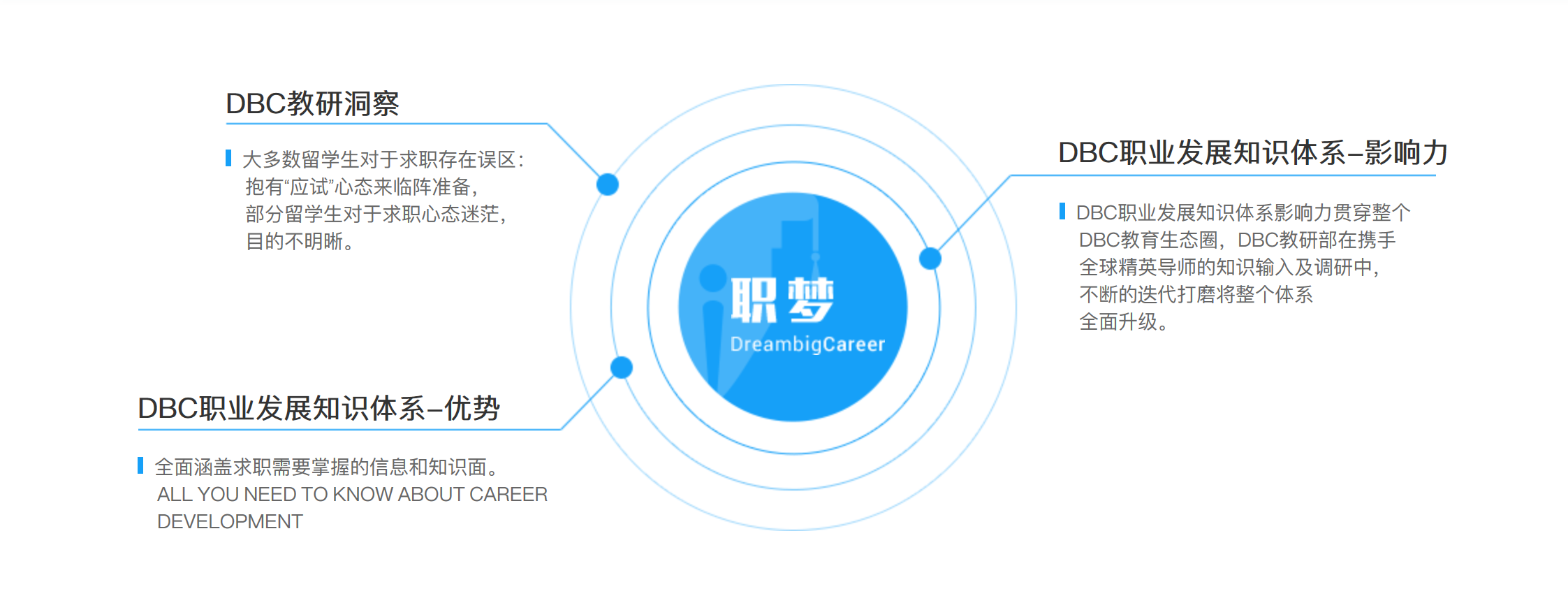 教育的核心關(guān)鍵在于人才的培養(yǎng),發(fā)揮數(shù)據(jù)資源的價值、促進個性人才的發(fā)展是未來人才培養(yǎng)的重要趨勢。DreambigCareer職夢(以下簡稱DBC職夢)是博實樂教育集團旗下的專門從事留學(xué)生職業(yè)規(guī)劃的子公司,也是第一家擁有APP的留學(xué)生求職輔導(dǎo)平臺。職夢自主研發(fā)“移動求職學(xué)院”在線學(xué)習(xí)系統(tǒng),專注于留學(xué)生職業(yè)發(fā)展綜合能力以及個性化發(fā)展能力培養(yǎng)與提升。2019年3月DBC職夢推出全新升級學(xué)習(xí)平臺——移動學(xué)院3.0,依托其官方APP、求職小蜜蜂、DBC學(xué)院、求職能力測評等微信小程序,以行業(yè)認(rèn)知、求職技能、職業(yè)素養(yǎng)為核心課程模塊,匯集全球2000+精英導(dǎo)師資源,500+官方合作企業(yè),有效構(gòu)建了提升個人競爭力的全方位求職移動產(chǎn)品矩陣。