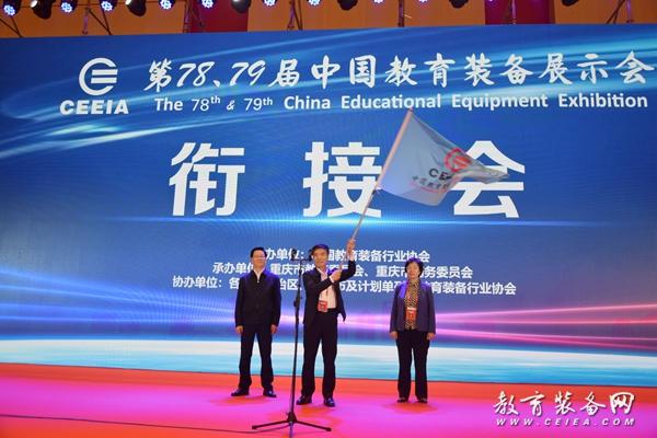 在第78屆、79屆中國教育裝備展示會會旗交接儀式環(huán)節(jié),重慶市教育委員會二級巡視員劉先海首先接過會旗,隨后將會旗交接給中國教育裝備行業(yè)協(xié)會會長王富,王富會長揮動旗幟后將會旗最后交接給了第79屆中國教育裝備展示會承辦單位代表廈門市政府副市長國桂榮。至此會旗成功交接,標志著第79屆中國教育裝備展示會正式進入倒計時階段。