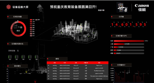 在此次展會中, 佳能不僅展示了與朋友圈伙伴們的豐富合作,同時還帶來了兩款針對逐漸普及的教育文印租賃服務的打印設備管理解決方案。首次展出的數據大屏(標準版),能通過網絡實時監測全國范圍內的佳能復合機設備,設備狀態、墨粉狀態、紙盒狀態、印量和費用成本等都一覽無余。另外一款佳能新研發的打印機遠程監控管理解決方案,可以免費提供給企業IT使用,無需部署和安裝,就能實現打印設備的遠程監控和管理。