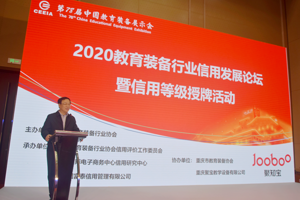 10月24日,2020教育裝備行業信用發展論壇暨信用等級授牌活動于第78屆中國教育裝備展示會期間在重慶市悅來國際會議中心舉行。本次論壇活動由中國教育裝備行業協會主辦,中國教育裝備行業協會信用評價工作委員會、中國國際電子商務中心信用研究中心、北京國富泰信用管理有限公司承辦,重慶市教育裝備協會、重慶聚寶教學設備有限公司協辦。