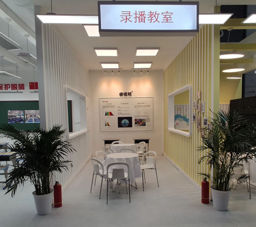 錄播教室展示區,采用的全光譜護目面板燈方案,燈具TLCI值高達99,符合影視燈評價標準,能夠提供華麗豐富、精美細致的畫面效果,讓攝影攝像更真實生動。此外,拓享睿視明全光譜燈具能夠提供明亮而不刺眼的光線,緩解眼睛干澀疲勞,其中650nm的光,可有效治療近視。而更少的藍光成份也有助于改善睡眠,讓人們的工作學習,更有效率。