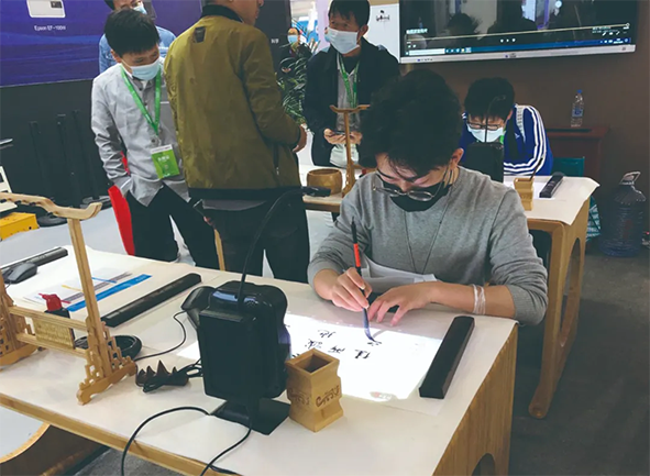 在展會(huì)現(xiàn)場(chǎng),羿飛也為參觀者準(zhǔn)備了精美的禮品,只需在翰墨派云書(shū)法教學(xué)系統(tǒng)的指導(dǎo)下完成一幅書(shū)法寫(xiě)作,就能領(lǐng)取一對(duì)古樸大方的鎮(zhèn)尺。大家躍躍欲試,活動(dòng)參與者眾多,親自感受了一把揮毫潑墨的樂(lè)趣。