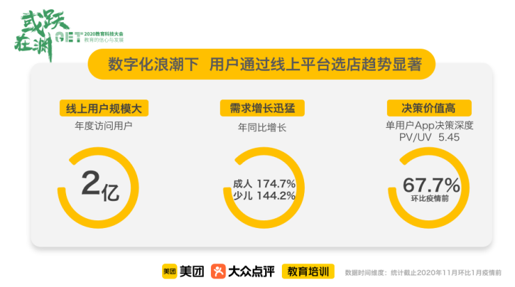 第一部分大家可以看到三組數據,疫情來臨包括疫情逐漸消退,在教育行業里大家談的最多的是線上教育,包括OMO、AI技術等可能帶來的一些行業變化,以及在疫情的大背景下持續推動行業發展的一些辦法。但是從平臺去看線下,尤其是植根于線下的機構這個視角來看,也有特別大的變化。以11月份為例,我們看到整個疫情在改變消費者的行為方式以及學員、家長的決策方式。