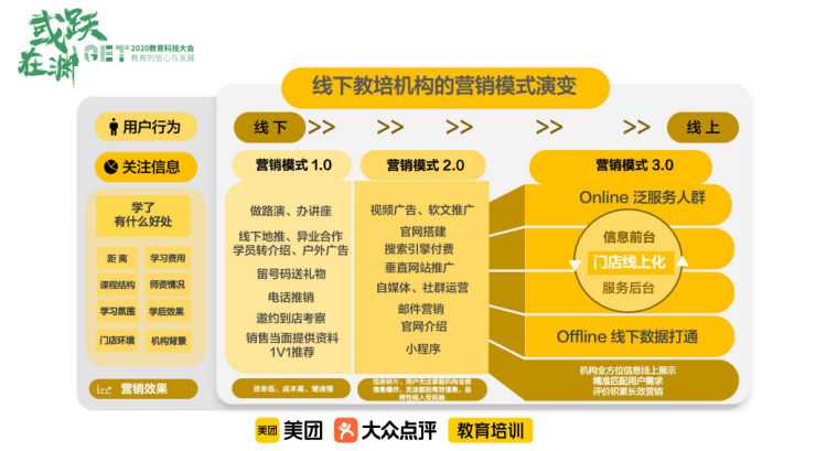 現在進入2.0的時代,大家開始學會用搜索、視頻廣告、自媒體等方式來招生,這是發生在5年前的事情。但上述招生方式,用戶所獲得的信息是非常碎片化的,如果是一個非常新的業態,可能用戶會記住你,但如果是傳統業態而且不是大品牌,用戶可能連品牌都記不住,更不可能留資給你。