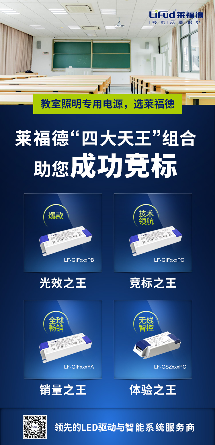 針對該現狀,從18年開始,國家及各地政府就已出臺系列政策保護學生用眼,其中最重要的政策之一則是對教室照明的標準規范,雖然已過去近兩年,但80%左右的項目仍處于未改造狀態。為積極響應國家政策給教室照明改造市場提供更優質的驅動控制,萊福德上市了教室照明專用電源“四大天王”組合,從普通改造,到高端智控,所有功能一應俱全。