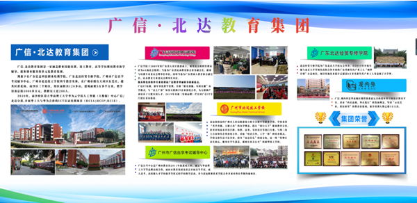廣信-北達教育旗下有廣東信息科技職業培訓學院、廣州市北達技工學校、廣州市廣信自考輔導中心、廣東北達經貿專修學院等多家教育培訓機構,是一家涵蓋職業技能培訓、技工教育、高等學歷繼續教育助學輔導、就業創業服務的多元化教育集團。旗下機構被省社會組織管理局授予4A級社會組織;當選為廣東省民辦教育協會常務副會長、職業與培訓專業委員會理事長單位;同時當選為廣東省成人教育協會副會長、民辦教育專業委員會理事長單位。