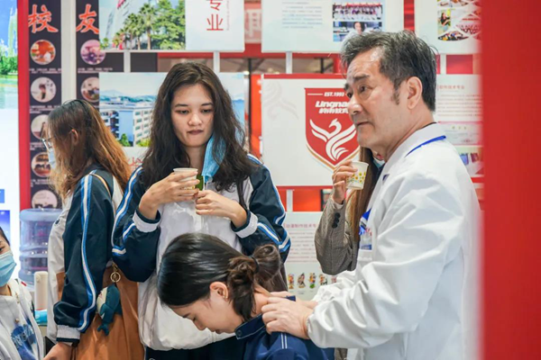 藥學院4名校友代表帶來的全息養生技術展示及義診,有針灸、刮痧、按摩多項中醫特色護理技術齊齊亮相,給現場觀眾提供免費體驗,受到大家的關注和熱捧。