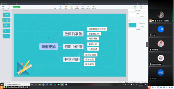 本次線上教研會緊貼寒假前的準備、寒假中的使用以及開學前的準備三個主線展開討論交流,共有近20名老師參與本次教研會。本期線上教研會特邀向陽實驗小學歐主任分享“寒假期間如何進行線上專題教學與輔導”的意見與要求,然后由希沃培訓師對“智慧課堂假期使用方案”進行培訓,最后解答智慧班老師提出的問題。