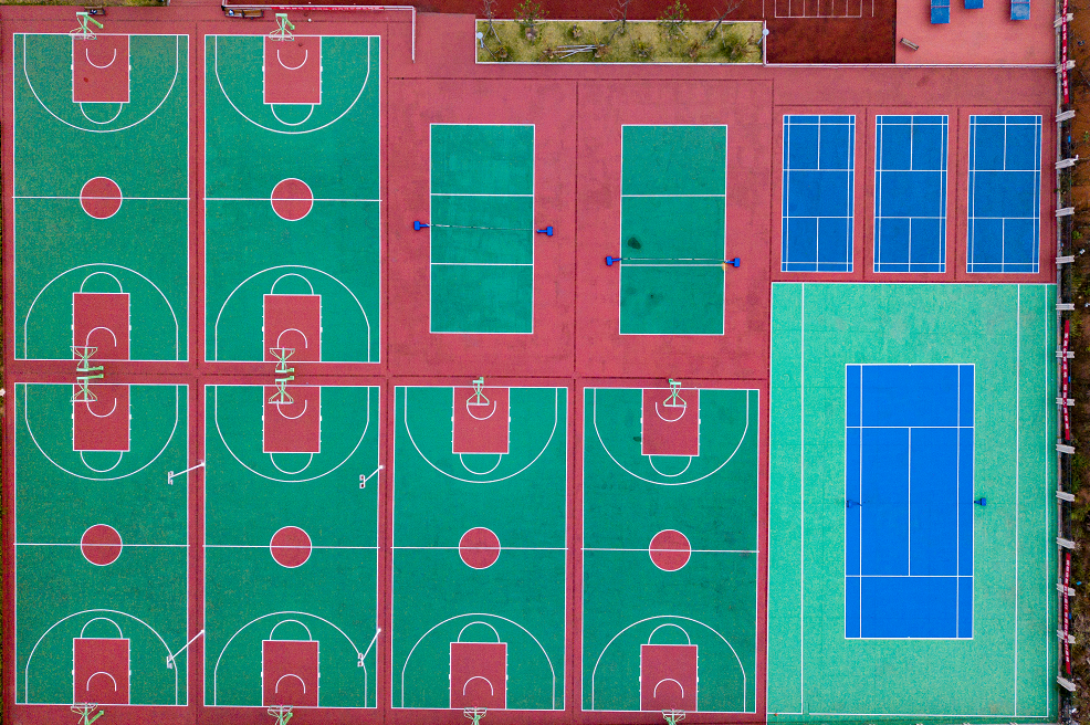 南湖新城學校綜合球場的建設原材料及施工技術均由廣州帝森DISEN提供支持,項目總面積約為4544㎡,包括籃球場、排球場、乒乓球場和網球場。