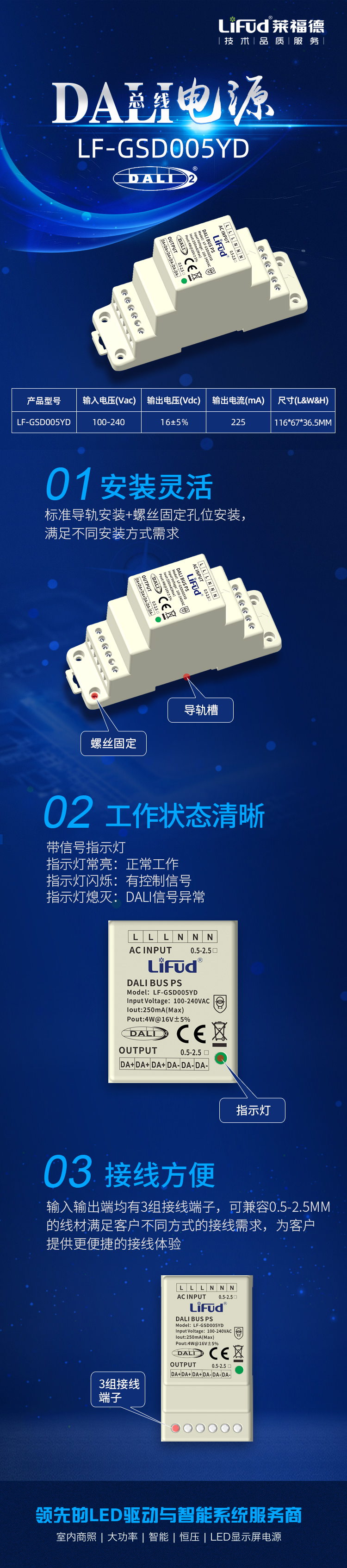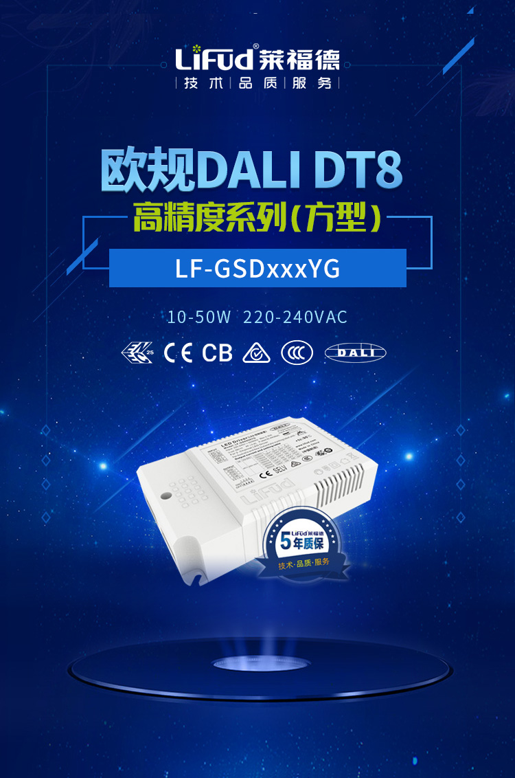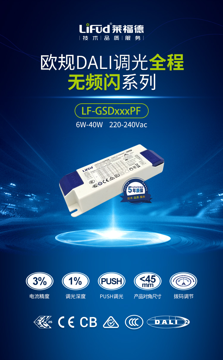 LF-GSDxxxYG是一款DALI恒流調(diào)光調(diào)色溫產(chǎn)品,功率覆蓋10-50W。該產(chǎn)品同時搭載Push調(diào)光,可實(shí)現(xiàn)不接入DALI系統(tǒng)也能0.1%~100%平滑調(diào)光、調(diào)光全程無頻閃、調(diào)光精度≤3%等優(yōu)勢,給到用戶多種選擇,備貨更簡單。