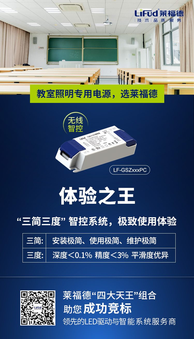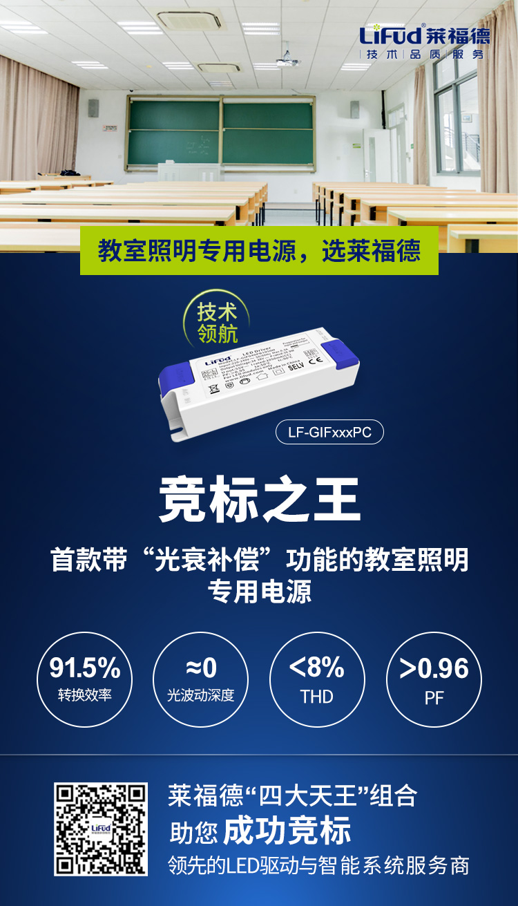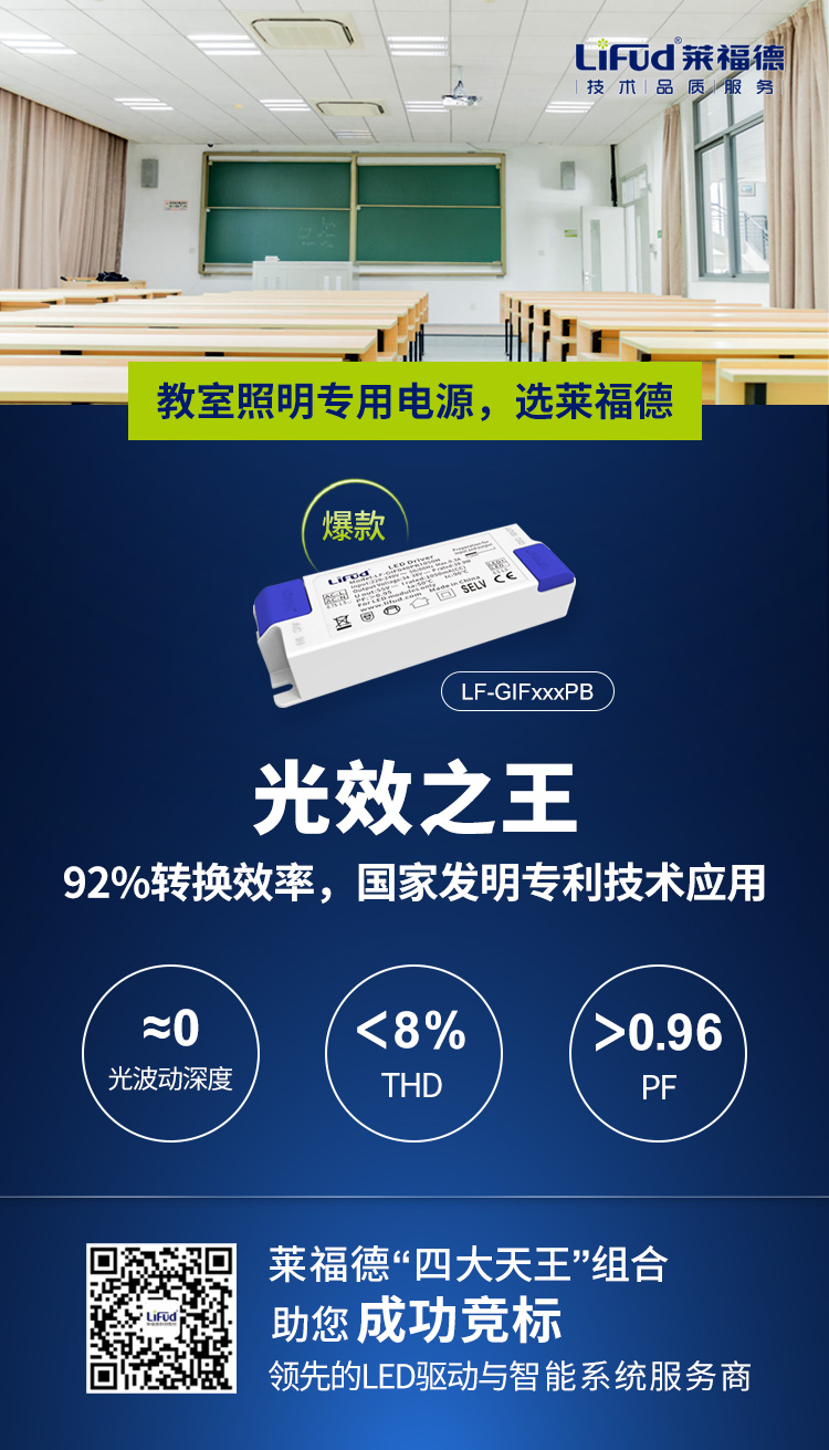 因一直堅持“健康無頻閃”和“高效節(jié)能”,萊福德產(chǎn)品深受教室照明廠家歡迎,特別是LF-GIFxxxYA,上市至今暢銷全球。今年,針對教師照明市場的需求,萊福德將YA參數(shù)性能升級,作為教室照明專用電源之一,同時推出LF-GIFxxxPB/PC兩款電源,補(bǔ)充教室照明專用系列。