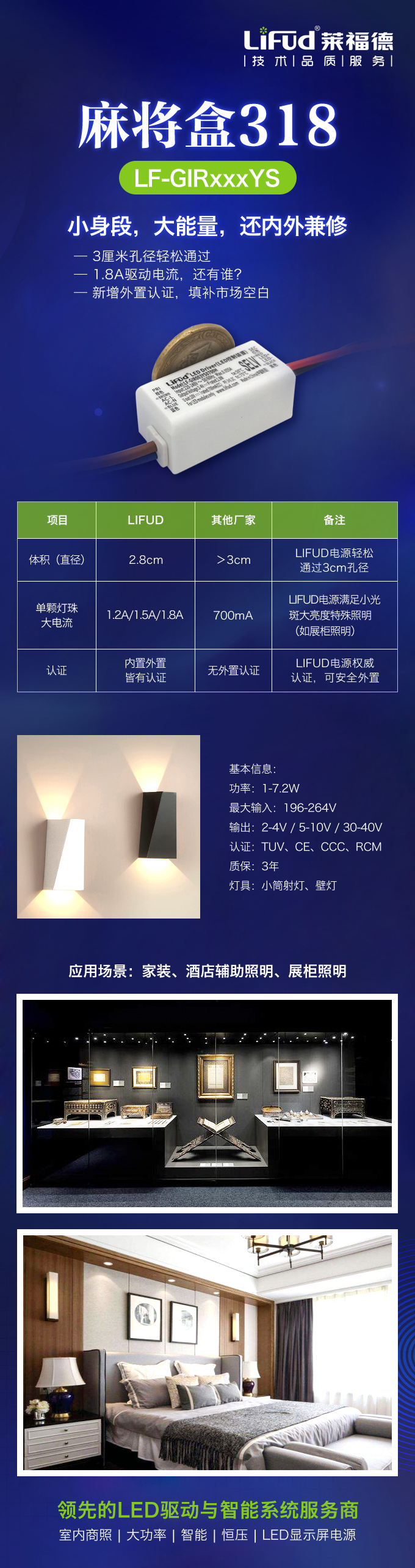 LF-GSDxxxPF是20年6月推出的一款6-40W的小體積DALI調(diào)光電源,最小W*H*L為30*20*142mm。該款產(chǎn)品在光亞展展出期間還吸引了云知光徐老師、恒坤彭總前來了解直播,最主要的原因在于該款產(chǎn)品的擁有一個特別的優(yōu)勢——小體積+頂級認(rèn)證。