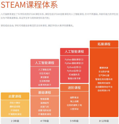 八爪魚教育是一家中小學校STEAM教育校園解決方案提供商。積極探索前沿 STEAM 教育,結合本土國情,研發適用于我國教育體 系及中小學現狀的 STEAM 課程及解決方案,融入9大常態教學場景,打造校園STEAM教育生態環境。