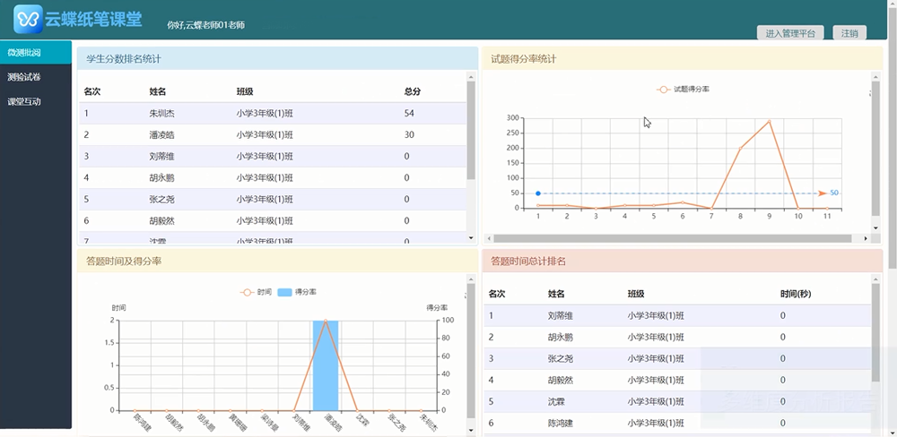 而在這堂運用了紙筆互動系統的數學課上,云蝶點陣數碼筆搭配印有點陣碼的課堂練習試卷,輔助老師隨時進行課堂練習。選擇題直接統計學生的作答情況,全班同學的答題結果、易錯項一目了然,講解更具有普遍性和針對性。