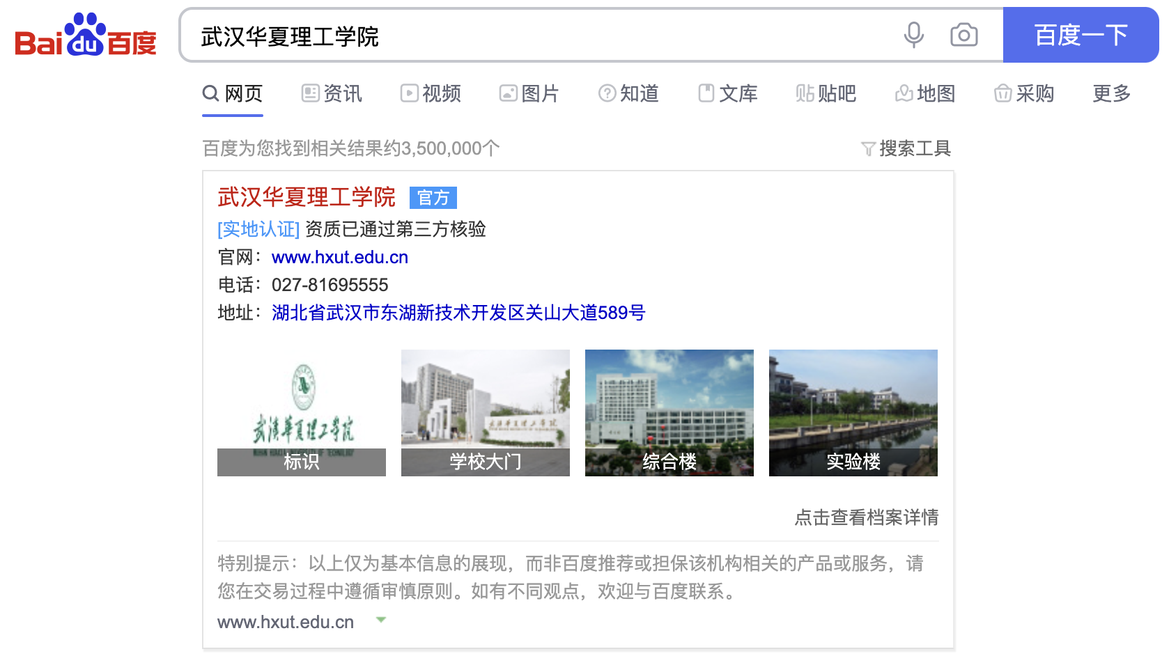 “武漢華夏理工學院”的百度認證結果展示頁