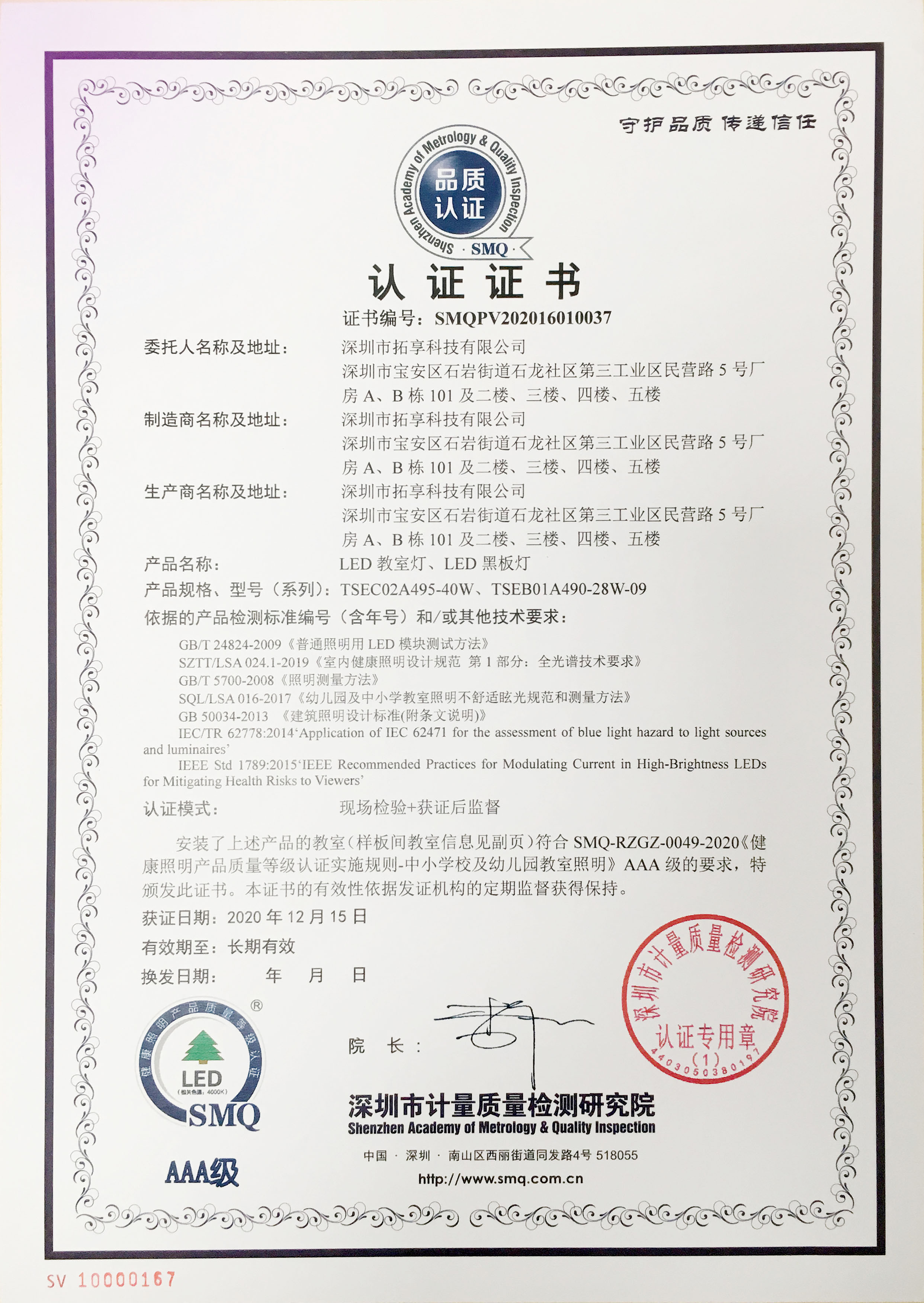 相較于其他方案,全光譜方案更貼合人體的生理節(jié)律,可以主動(dòng)適應(yīng)人體的需要。全光譜燈具更少的短波高能藍(lán)光,可減少對(duì)視力傷害。超高的顯色指數(shù),也讓教室空間的色彩呈現(xiàn)更豐富、艷麗。經(jīng)過(guò)大半年的探索與深度研發(fā),拓享睿視明在全光譜健康照明領(lǐng)域再次邁進(jìn), 獲得深圳計(jì)量質(zhì)量檢測(cè)研究院第一張AAA級(jí)全光譜健康光環(huán)境認(rèn)證。