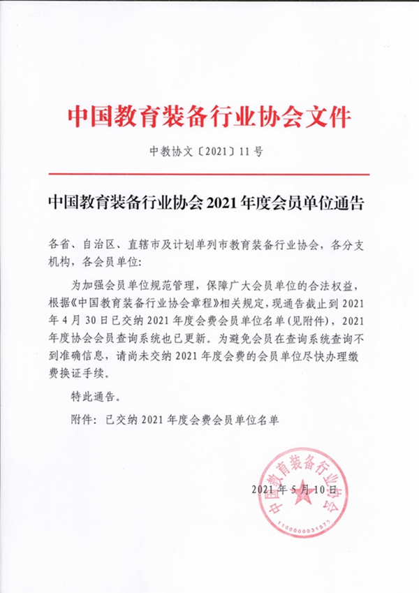 為加強會員單位規范管理,保障廣大會員單位的合法權益,根據《中國教育裝備行業協會章程》相關規定,現通告截止到2021年4月30日已交納2021年度會費會員單位名單(見附件),2021年度協會會員查詢系統也已更新。為避免會員在查詢系統查詢不到準確信息,請尚未交納2021年度會費的會員單位盡快辦理繳費換證手續。