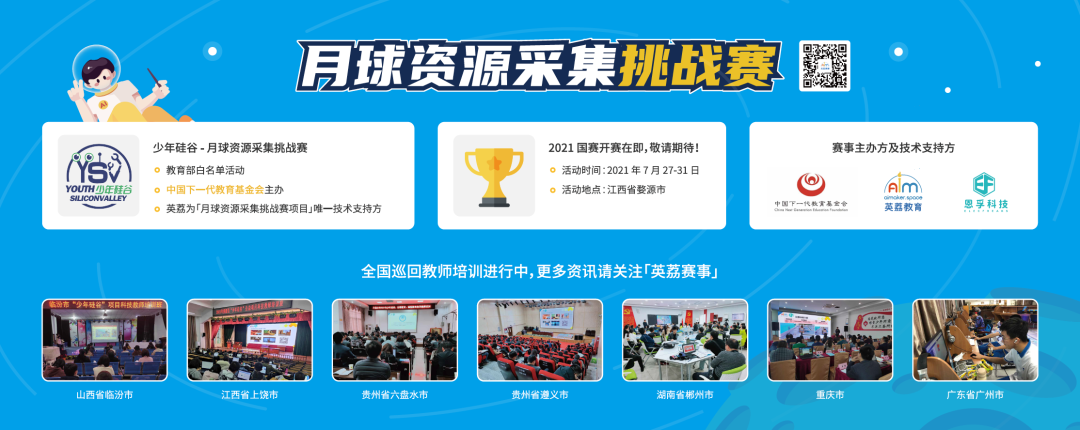 英荔教育作為「少年硅谷月球資源采集挑戰賽」唯一技術支持方,為競賽制定比賽規則、設計月球基地賽臺及道具,對參賽選手團隊進行賽前培訓,同時將全程在比賽現場提供技術支持,保證比賽的競技性、智能性、流暢性及公平性。