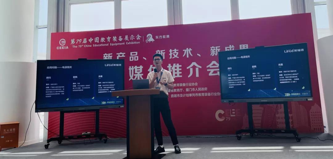 開展第二天,萊福德受中國教育裝備行業協會邀請,在廈門國際會議展覽中心B2館鷺江廳序廳進行“新產品、新技術、新成果”發布會,本次發布會總計19家教育裝備企業參與,其中照明細分領域僅有萊福德與立信達兩家受邀參加。