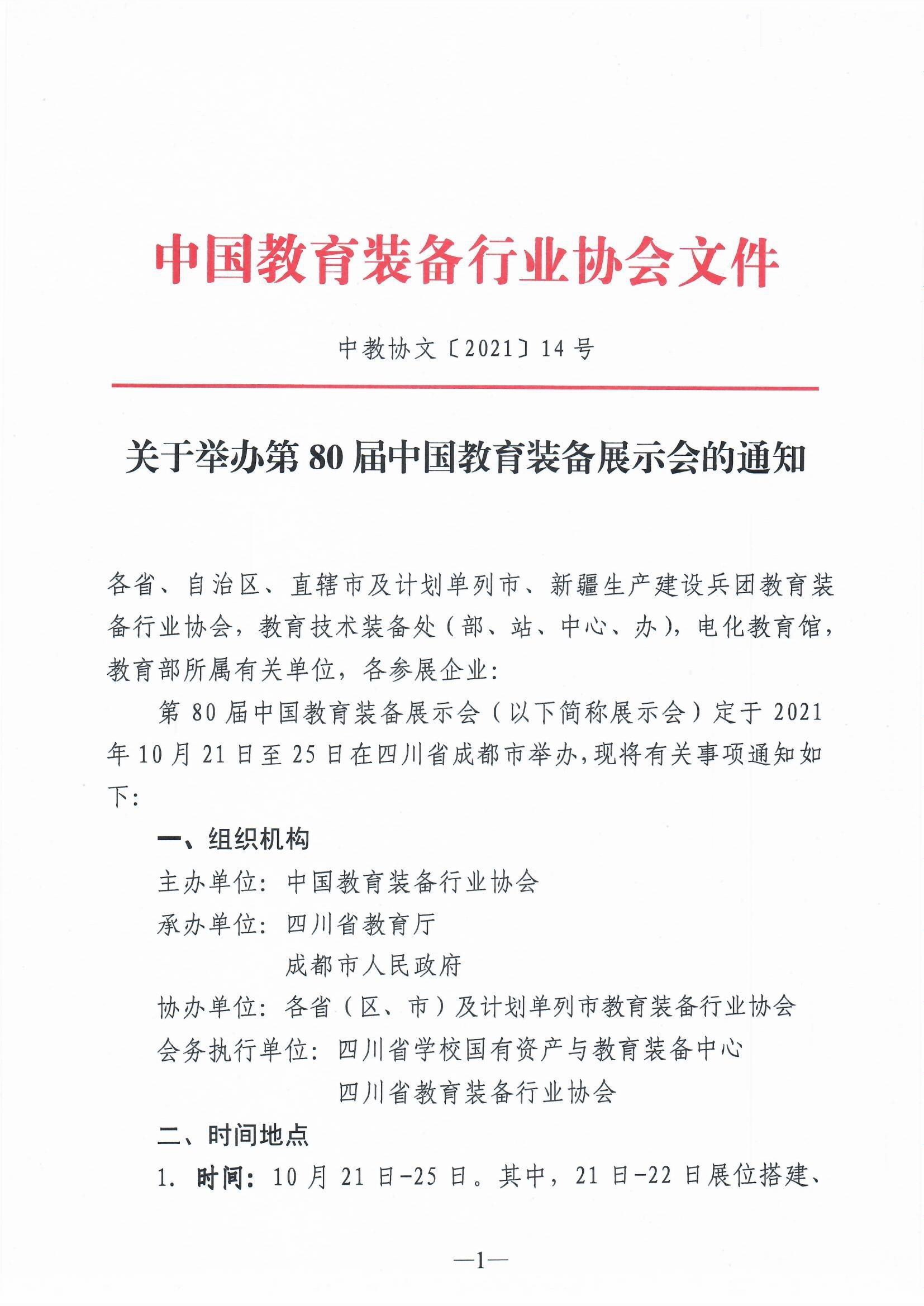 第80屆中國教育裝備展示會(以下簡稱展示會)定于2021年10月21日至25日在四川省成都市舉辦,現將有關事項通知如下: