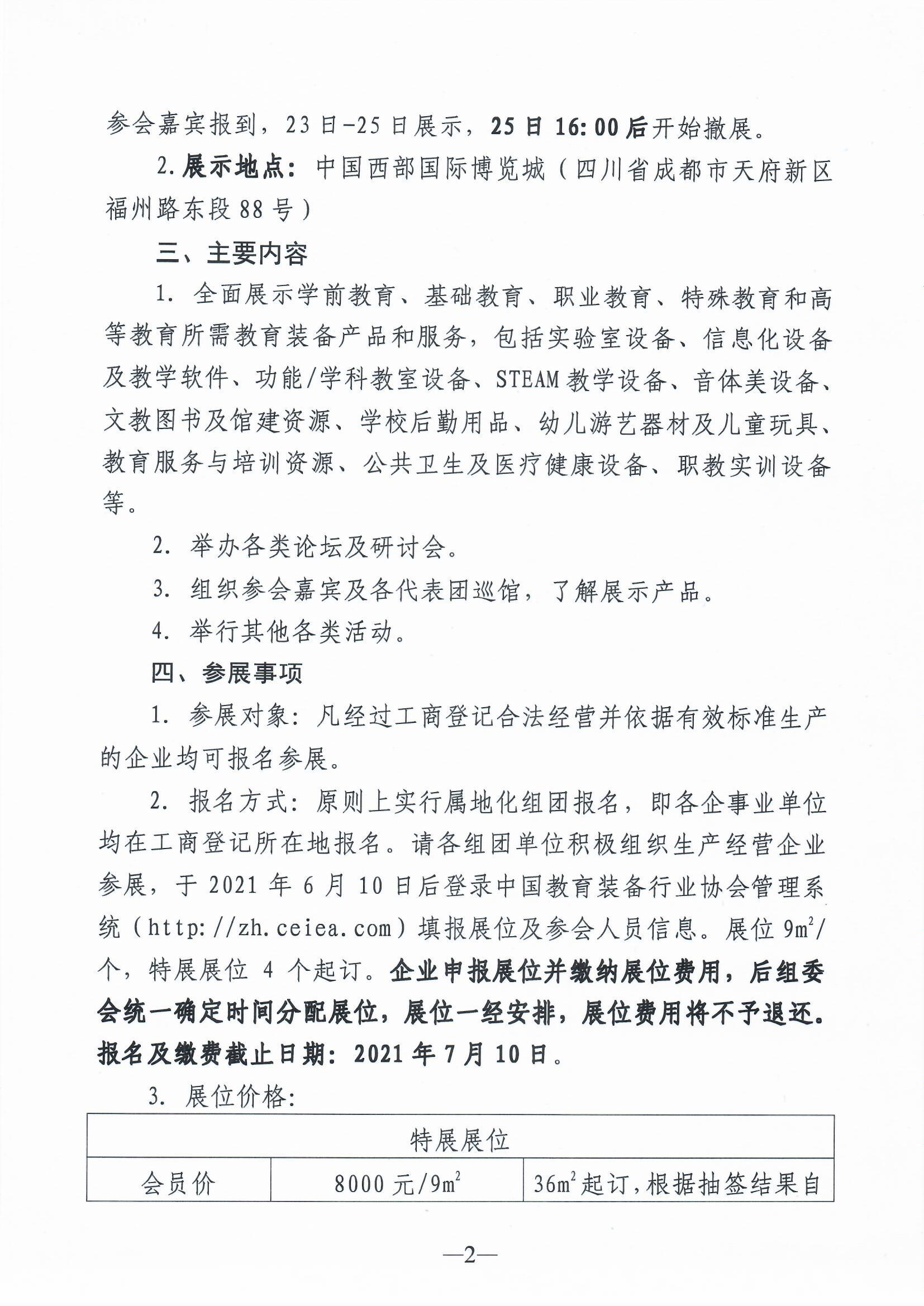 2.報名方式:原則上實行屬地化組團報名,即各企事業單位均在工商登記所在地報名。請各組團單位積極組織生產經營企業參展,于2021年6月10日后登錄中國教育裝備行業協會管理系統(http://zh.ceiea.com)填報展位及參會人員信息。展位9m2/個,特展展位4個起訂。企業申報展位并繳納展位費用,后組委會統一確定時間分配展位,展位一經安排,展位費用將不予退還。報名及繳費截止日期:2021年7月10日。
