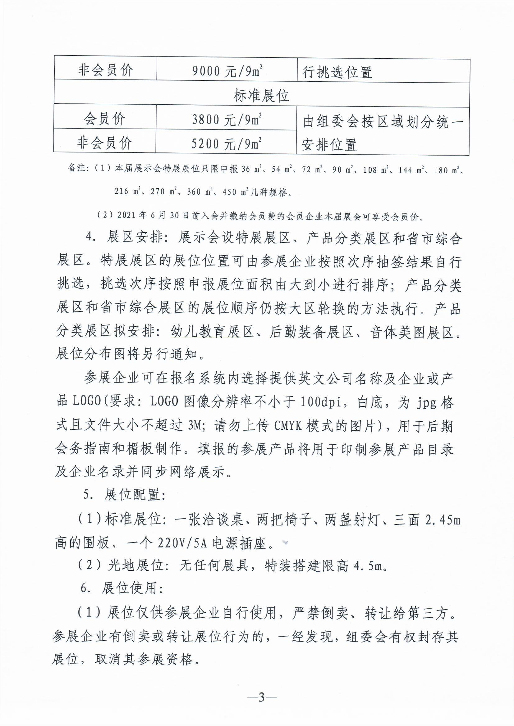 4.展區安排:展示會設特展展區、產品分類展區和省市綜合展區。特展展區的展位位置可由參展企業按照次序抽簽結果自行挑選,挑選次序按照申報展位面積由大到小進行排序;產品分類展區和省市綜合展區的展位順序仍按大區輪換的方法執行。產品分類展區擬安排:幼兒教育展區、后勤裝備展區、音體美圖展區。展位分布圖將另行通知。