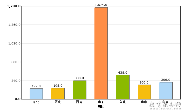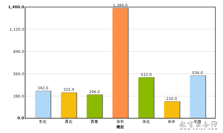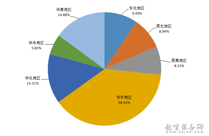 根據(jù)4月份收集到的教育裝備招標(biāo)采購信息(見圖2、圖3):教育裝備招標(biāo)采購區(qū)域信息數(shù)據(jù)共3602條(招標(biāo)采購信息地區(qū)設(shè)置為單選項(xiàng))。其中,華東地區(qū)招標(biāo)采購信息量1384條,占區(qū)域信息量的38.42%;華南地區(qū)招標(biāo)采購信息量536條,占區(qū)域信息量的14.88%;華北地區(qū)招標(biāo)采購信息量512條,占區(qū)域信息量的14.21%;東北地區(qū)招標(biāo)采購信息量342條,占區(qū)域信息量的9.49%;西北地區(qū)招標(biāo)采購信息量322條,占區(qū)域信息量的8.94%;西南地區(qū)招標(biāo)采購信息量296條,占區(qū)域信息量的8.22%;華中地區(qū)教育裝備招標(biāo)采購信息量均為210條,占區(qū)域信息量的5.83%。