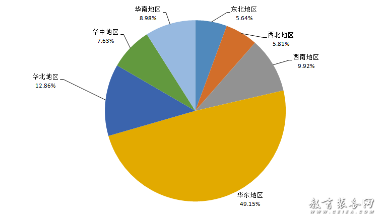 4月份教育裝備中標(biāo)采購區(qū)域信息數(shù)據(jù)共3406條(中標(biāo)信息區(qū)域設(shè)置為單選項(xiàng))見圖6、圖7,華東地區(qū)中標(biāo)信息量1674條,占區(qū)域信息量的49.15%;華北地區(qū)中標(biāo)信息量438條,占區(qū)域信息量的12.86%;西南地區(qū)中標(biāo)信息量338條,占區(qū)域信息量的9.92%;華南地區(qū)中標(biāo)信息量306條,占區(qū)域信息量的8.98%;華中地區(qū)中標(biāo)信息量260條,占區(qū)域信息量的7.63%;西北地區(qū)中標(biāo)信息量198條,占區(qū)域信息量的5.81%;東北地區(qū)教育裝備中標(biāo)信息量192條,占區(qū)域信息量的5.64%。