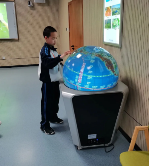 教室一邊擺放的多點觸控多媒體球幕投影演示儀,通過動畫演示,可以清楚了解經線、經度、緯線、緯度劃分、本初子午線等知識點。同學觸控球面,翻轉球體,尋找本初子午線的準確位置,回答問題變得容易。