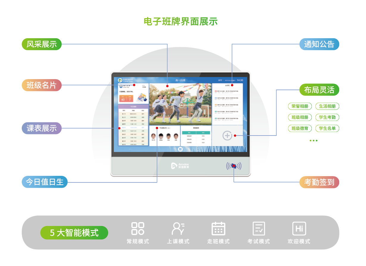 作為教育行業領先的設備制造商和解決方案服務商,安道教育不斷思索教育和學習的本質,深入到學校,真正理解師生需求,針對學校、老師、家長、學生不同角色的多種需求,為此推出的安道云班牌,是專為學校打造的校園文化建設、班級考勤、班級信息展示的信息化產品,具有展示校園文化、班級文化、學校安全教育、班級考勤、課程安排、活動資訊、通知信息等輔助教學功能,搭建家校溝通橋梁,促進家校共育,助力校園信息化建設。
