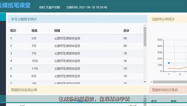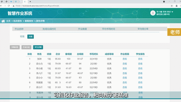 考試結(jié)果生成多維度報告,全班學(xué)生考試成績、用時、正確率、書寫筆跡一目了然,不僅關(guān)注成績,更關(guān)注成績的組成,全面提升教學(xué)效果。