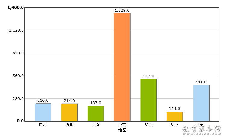 根據(jù)5月份收集到的教育裝備招標采購信息(見圖2、圖3):教育裝備招標采購區(qū)域信息數(shù)據(jù)共3448條(招標采購信息地區(qū)設置為單選項)。其中,華東地區(qū)招標采購信息量1306條,占區(qū)域信息量的37.88%;華北地區(qū)招標采購信息量721條,占區(qū)域信息量的20.91%;華南地區(qū)招標采購信息量474條,占區(qū)域信息量的13.75%;西北地區(qū)招標采購信息量269條,占區(qū)域信息量的7.80%;東北地區(qū)招標采購信息量243條,占區(qū)域信息量的7.05%;西南地區(qū)招標采購信息量233條,占區(qū)域信息量的6.76%;華中地區(qū)教育裝備招標采購信息量均為202條,占區(qū)域信息量的5.86%。