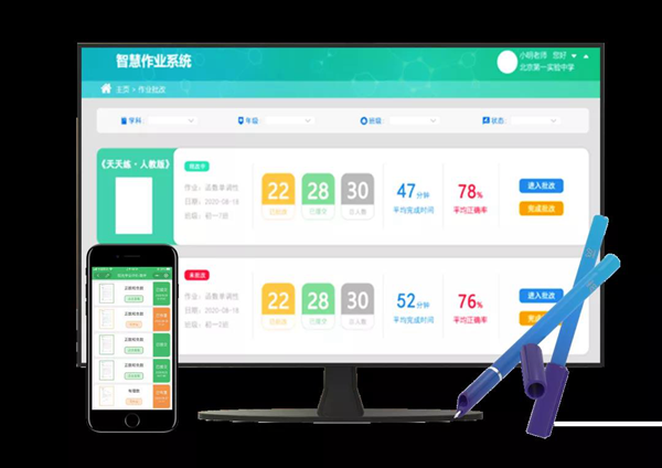 針對練習作業和小測大考,紙筆教學系統都能實現智慧批閱,客觀題由系統自動批改,老師在線批改主觀題后即刻生成成績報告,答題結果、易錯項一目了然,大大提高教學效率,為老師減負增效。