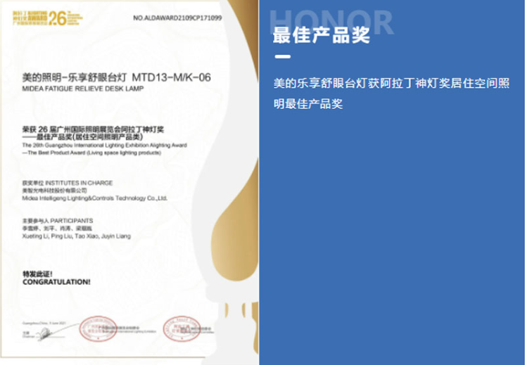獲得最佳產品獎的美的樂享臺燈,所采用自主外觀、結構、電控專利設計,產品整體操作方便,可多方向調角度。產品整體光電色、眩光、壽命等性能優秀。