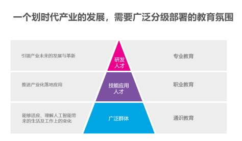 鐘永認為,“一個劃時代產業的發展,需要廣泛分級部署的教育氛圍�!贬槍V泛群體、技能應用人才和研發人才這三類人才梯隊,優必選科技打造了從K12到高校的貫通式培養體系,分層部署,用通識教育培養能夠適應及理解人工智能時代變化的青少年人才、用職業教育培養能推進產業化落地應用的技能型人才、用專業教育培養引領產業未來的發展與革新的科研人才。