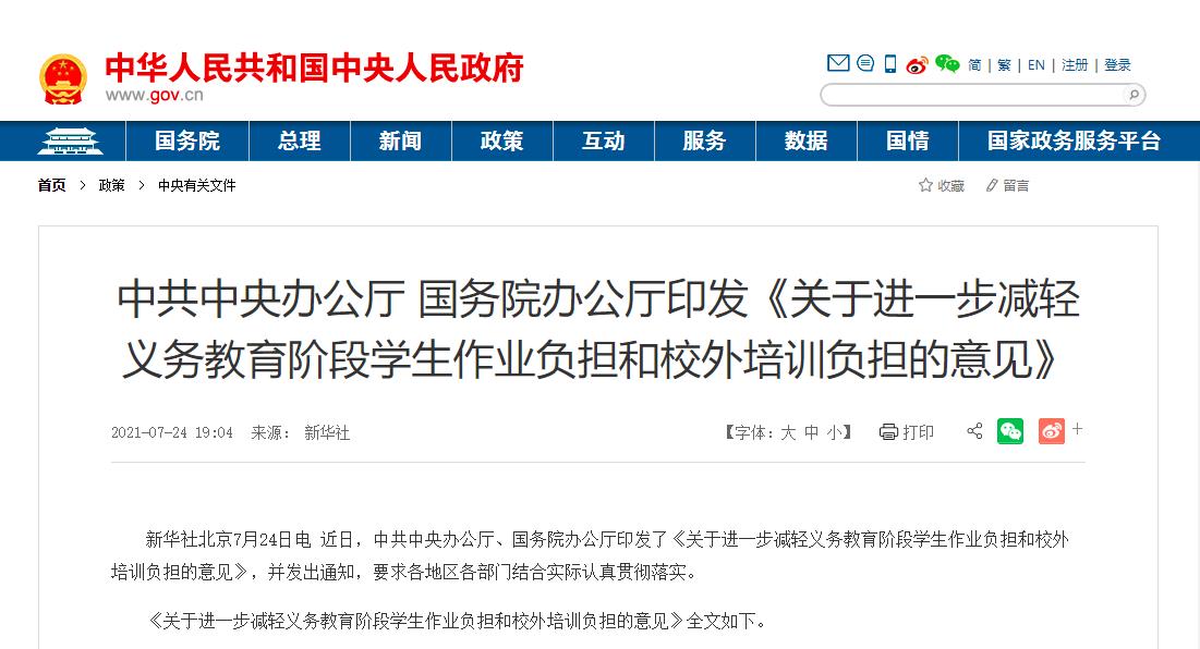 近日,中共中央辦公廳、國務院辦公廳印發了《關于進一步減輕義務教育階段學生作業負擔和校外培訓負擔的意見》,宣告“雙減”政策正式落地。
