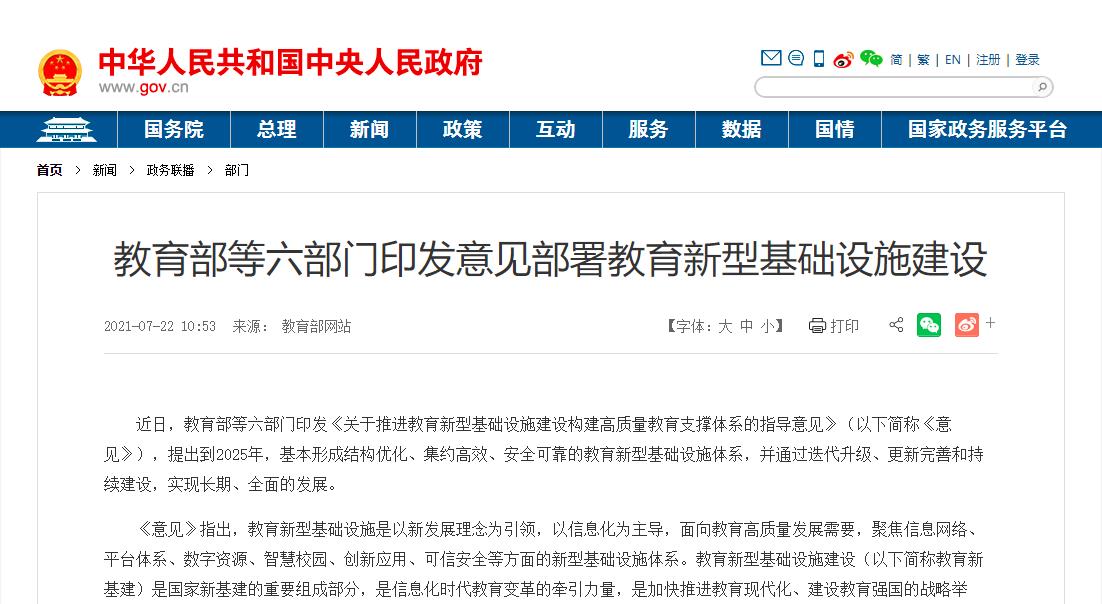 與此同時,在今年七月教育部等六部門印發的《關于推進教育新型基礎設施建設構建高質量教育支撐體系的指導意見》指出,教育新型基礎設施建設是國家新基建的重要組成部分,以教育新基建壯大新動能、創造新供給、服務新需求,促進線上線下教育融合發展,推動教育數字轉型、智能升級、融合創新,支撐教育高質量發展。