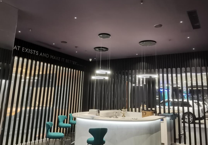 展廳中筒燈、條形燈及造型燈使用萊福德智能控制電源配合快思聰DALI主機,對每一盞燈色溫、亮度精準調節,完美詮釋勞斯萊斯不同系列不同風格——線條冷光凸顯科技十足“顛覆想象,風采耀世”的銀白幻影,筒燈暖光領略庫里南SUV“萬境皆從容,悠然天地間”的豪情肆意……
